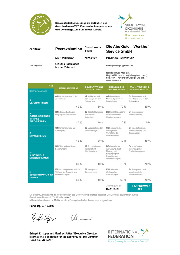 Sozialverträglichkeit anstatt bloßer Gewinnmaximierung, Nachhaltigkeit anstelle ungebremsten Wachstums, Kooperation statt Konkurrenz: Die Gemeinwohl-Ökonomie (GWÖ) ist ein Gegenentwurf zur aktuellen Wirtschaftsweise. Sie kann von jedem einzelnen Unternehmen und jeder einzelnen Organisation unterstützt und umgesetzt werden. Wir bei der AboKiste haben 2023 erstmals eine Bilanz nach der Gemeinwohl-Matrix erstellt und einen GWÖ-Bericht verfasst.